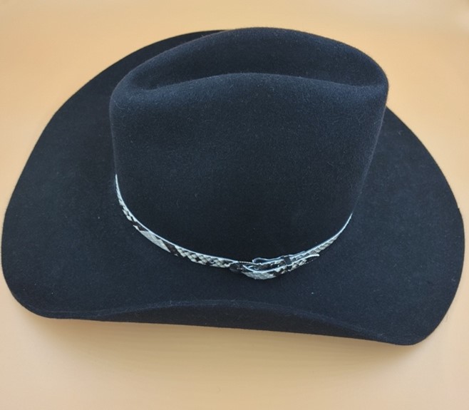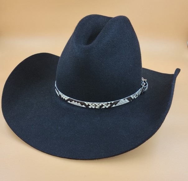 “Step boldly into the arena of timeless style with the “Gus” – your essential accessory for achieving that iconic Western look. Each hat is crafted from a luxurious 230-gram Fine Fur Felt, promising not only a rugged durability but also an exquisite hand feel that speaks to the connoisseur of classic craftsmanship. The standout feature, a genuine Snake Skin band, winds around the base, offering a touch of the wild and a nod to the fearless spirit of the frontier.